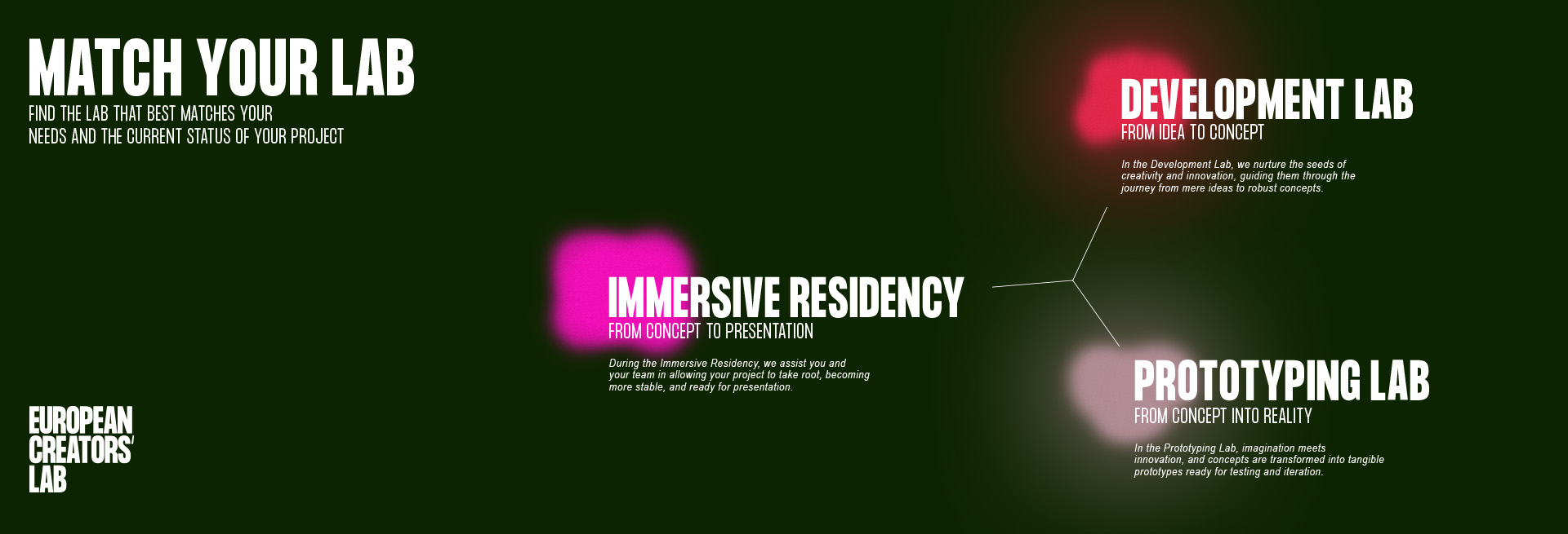 Our labs are unique in their methodology, approach and implementation. We prepare an inspiring, protected and non-competitive space for creatives in the deep conviction that innovation thrives best in a multi-disciplinary environment.
